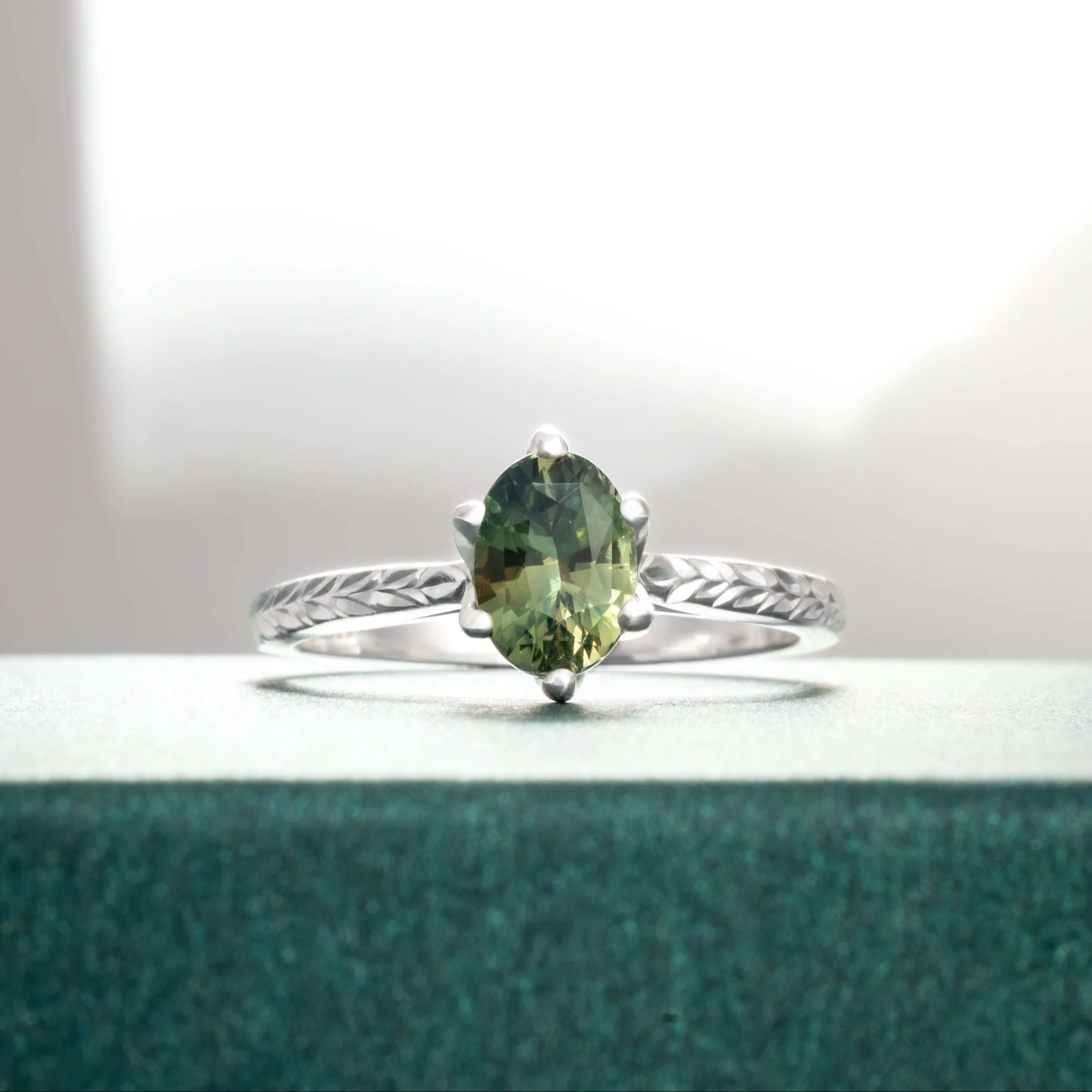 I designed Elowyn as a gentle vow in metal and stone, your choice of centre stone with this customisable ring setting. Along the shoulders, I’ve hand-engraved laurel leaves to symbolise a love that keeps flourishing. The silhouette is airy and romantic, with a soft open gallery with either a six prong tulip setting or four double prongs.