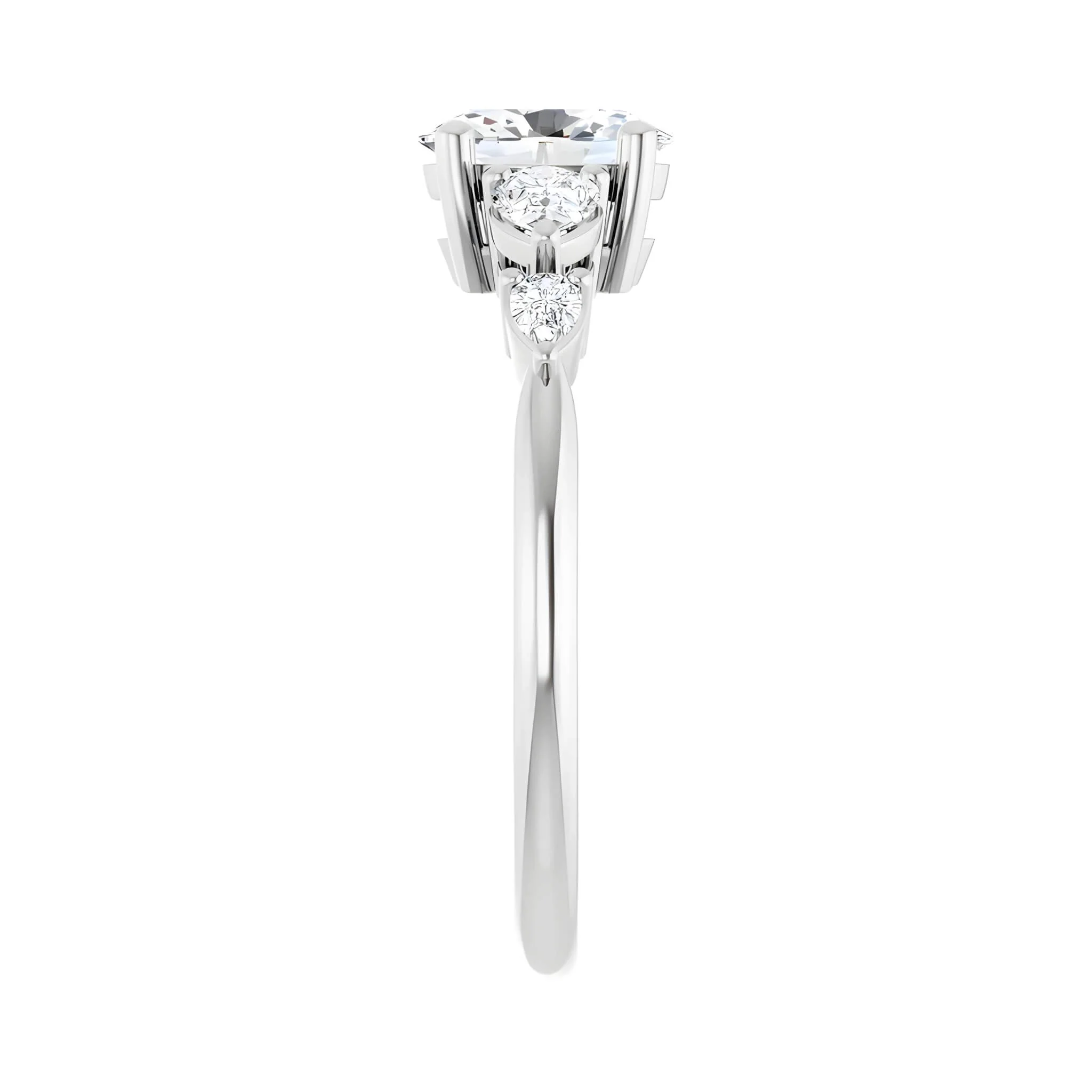 The Evalin, made to feel like a quiet sunrise: an oval centre stone lifted by a taper of sparkling diamonds that gather like a small constellation on each shoulder. The light lives on the stones in this design, with graduated accents that lead the eye outward in a soft sweep. It’s elegant, modern, and a little celestial, made to let your centre stone take the spotlight.