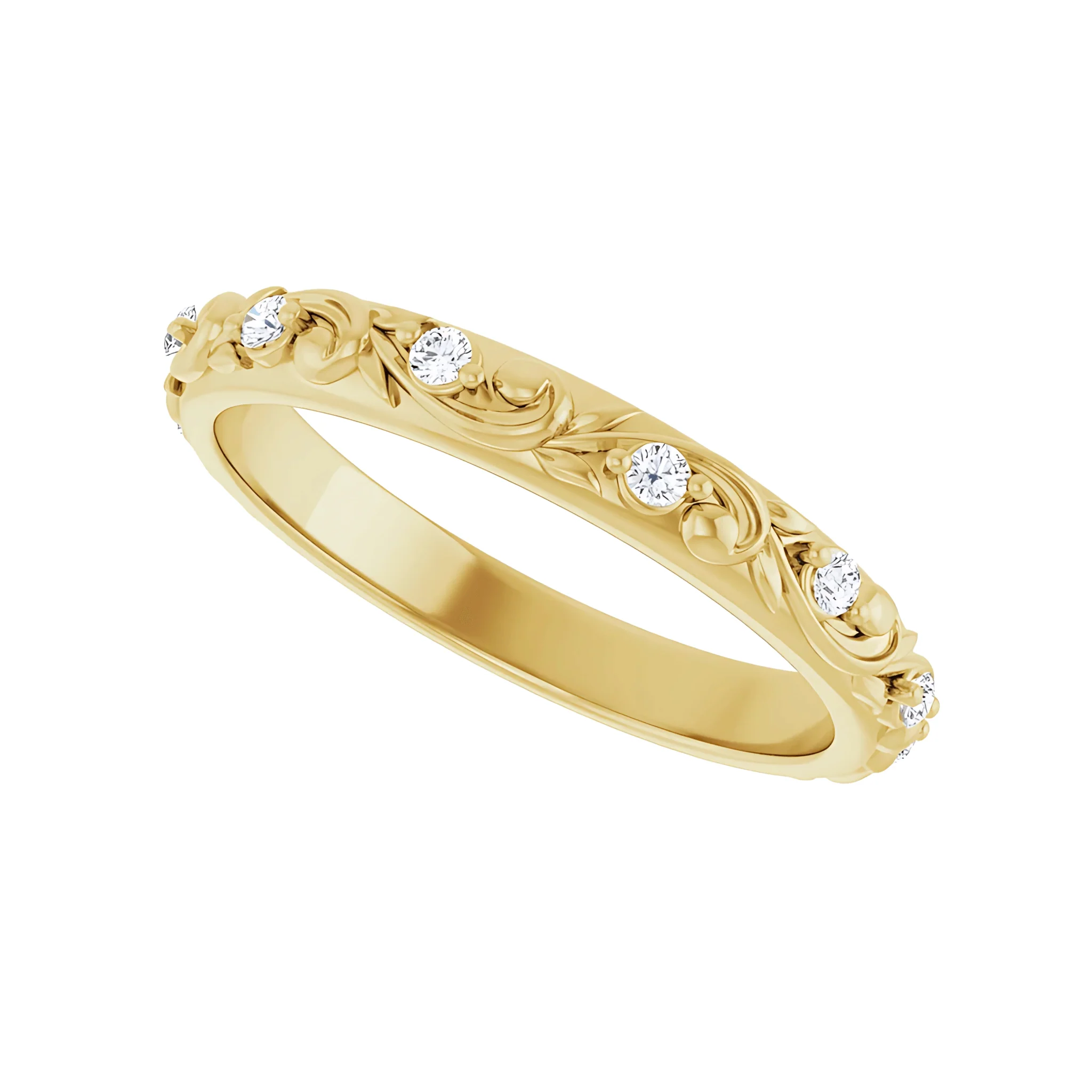This Vine and Leaf Eternity Band is a timeless symbol of love that grows and flourishes, just like the bond you share. The sculpted vines and leaves wrap gracefully around the band. Twelve 1.5mm diamonds are set into the band, adding a touch of brilliance that catches the light with every movement, like moments of love sparkling throughout the years.