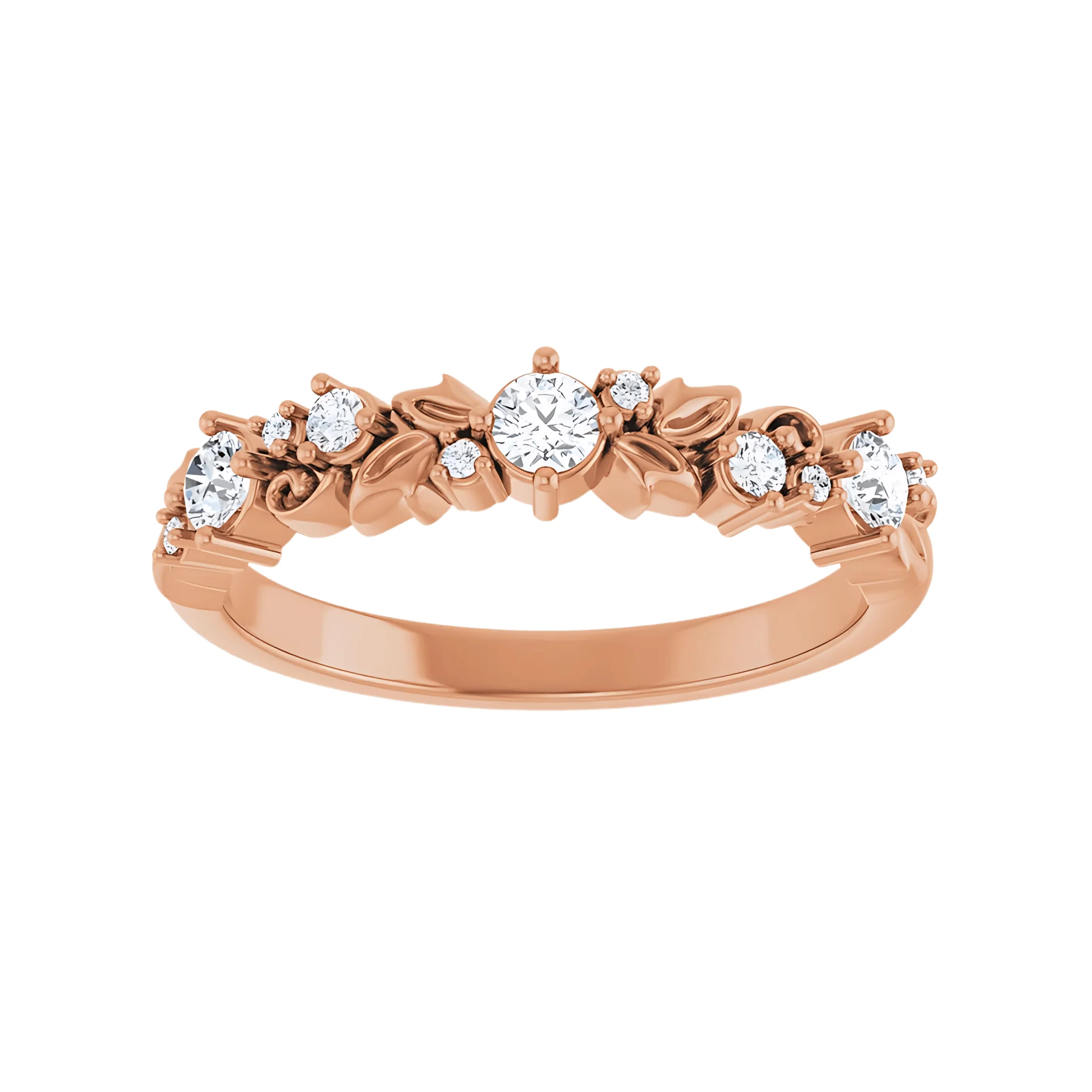 This half eternity band features sculpted roses and leaves, with diamonds delicately nestled at the heart of each rose. The intricate design wraps halfway around the band, while the underside remains a classic D-shape profile, ensuring comfort and elegance for everyday wear.